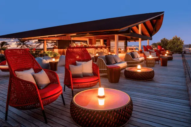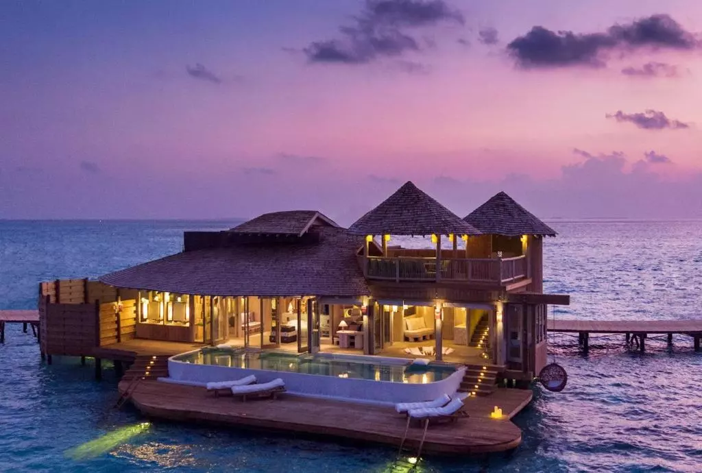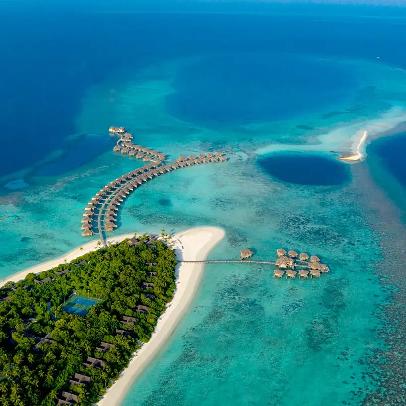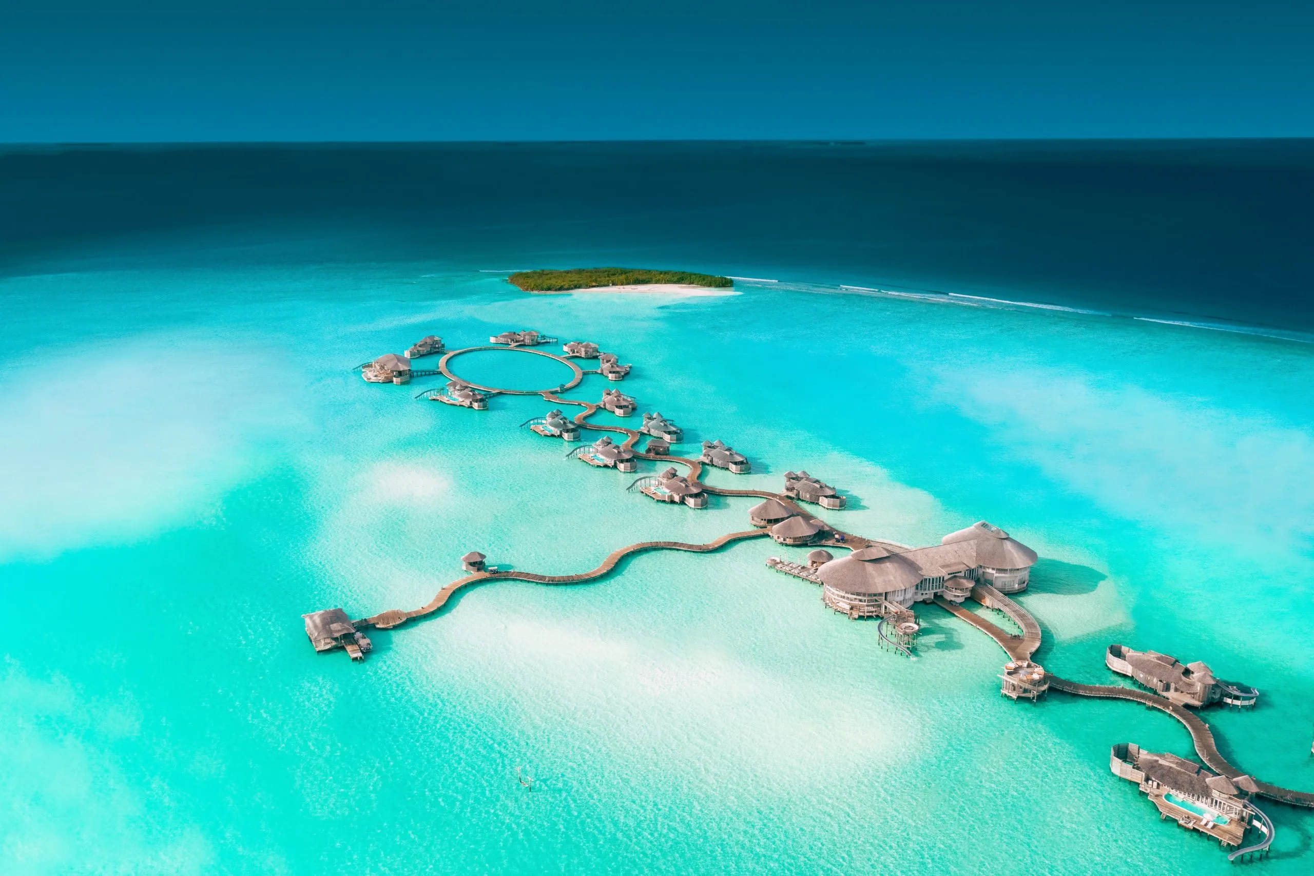 113 Luxury Villas and Suites, Five Star Restaurants, Two Bars, a Wine Cellar and an Over-The-Water Spa, located in a secluded reef island in Maldives.